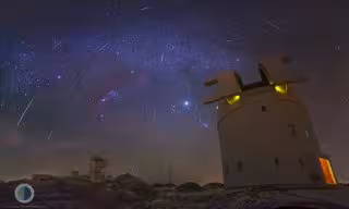 Gemínidas sobre el Observatorio del Teide la noche del 14 de diciembre de 2012. En primer plano se muestra el Telescopio OGS (ESA). Centrada en la imagen la constelación de Orión y el objeto más brillante es el Planeta Júpiter - JUAN CARLOS CASADO