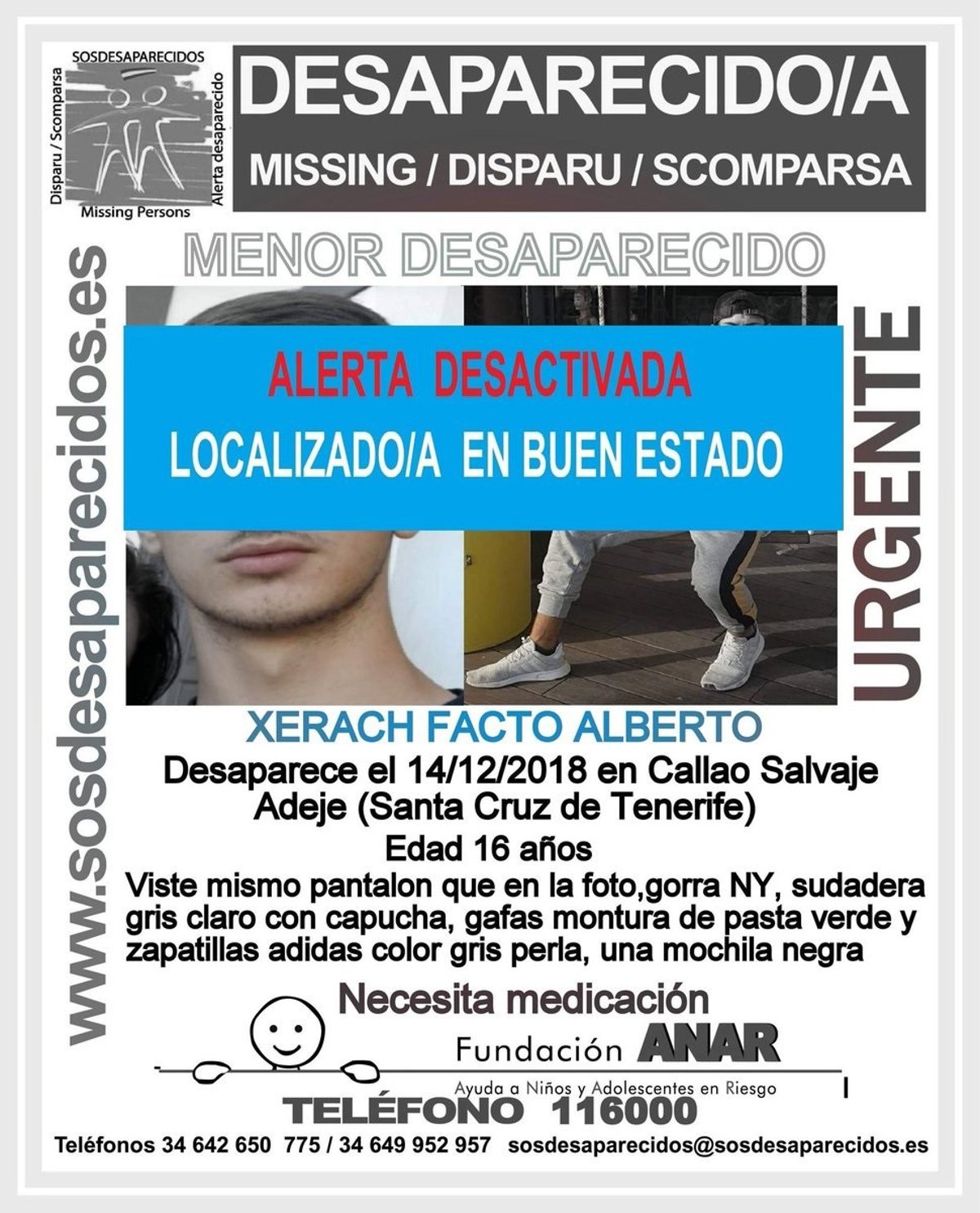 La asociación 'sosdesaparecidos' ha informado este domingo de que Xerach Facto Alberto, un joven de 16 años desaparecido en el municipio de Adeje, en el sur de Tenerife, ha sido localizado en buen estado, según ha informado a través de su cuenta oficial de Twitter.