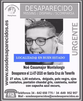 La Asociación 'sosdesaparecidos' ha informado que Noé Casamajor Montelongo, un joven de 27 años desaparecido en Santa Cruz de Tenerife, ha sido localizado en buen estado, según han informado a través de sus cuentas oficiales de Twitter.