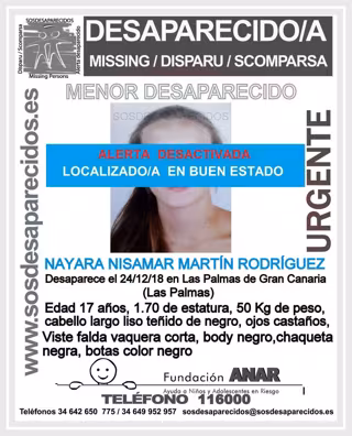 La asociación 'sosdesaparecidos' ha informado de que Nayara Nisamar Martín Rodríguez, una menor de 17 años desaparecida en Las Palmas de Gran Canaria, ha sido localizada en buen estado en la zona de Amatriche, según ha informado a través de su cuenta oficial de Twitter.