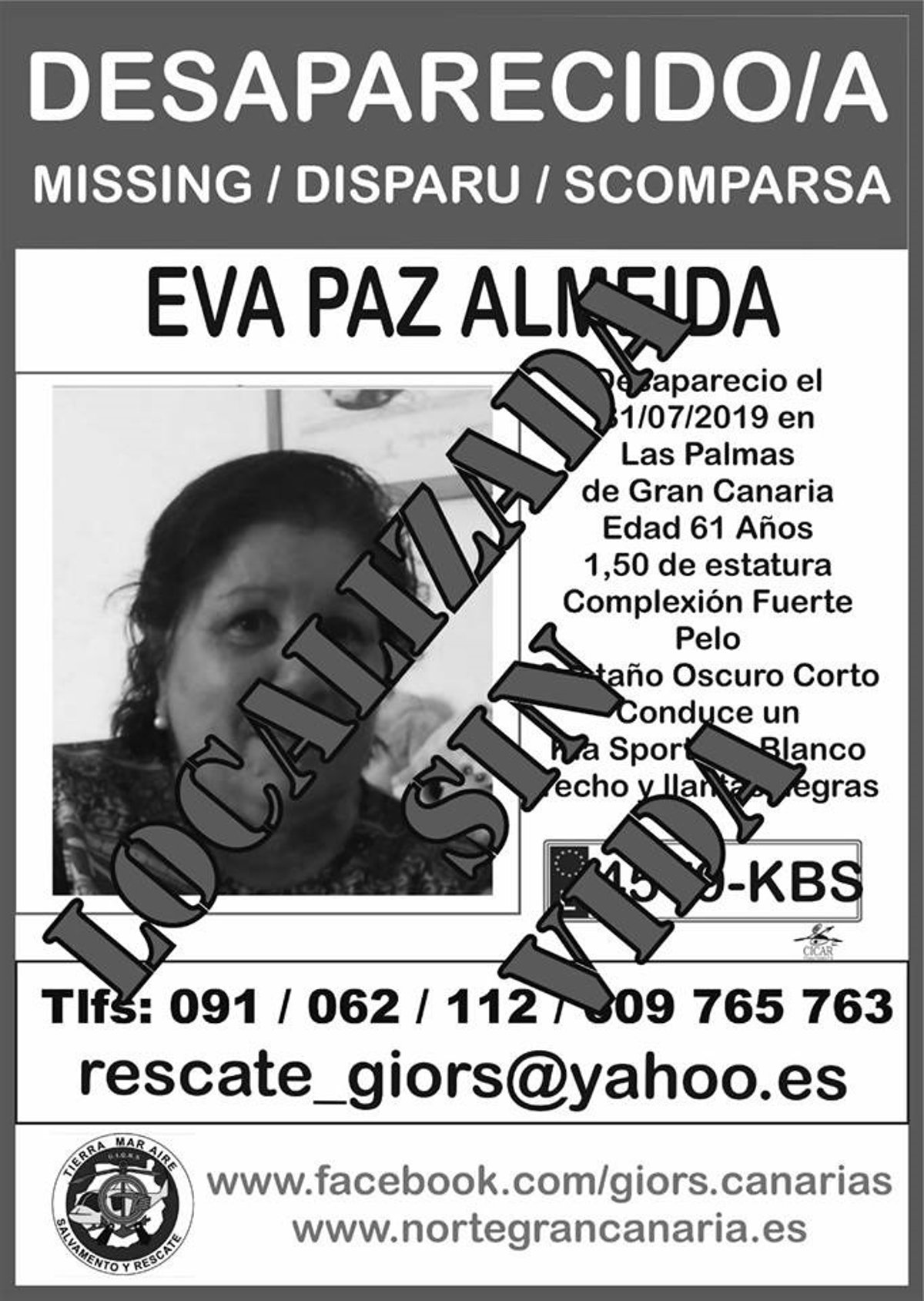Eva Paz Almeida, una mujer de 61 años desaparecida el pasado miércoles en Las Palmas de Gran Canaria, ha sido localizada sin vida, según ha informado el Grupo de Intervención Operativo de Rescate y Salvamento (GIORS) Canarias en su página oficial de Facebook.