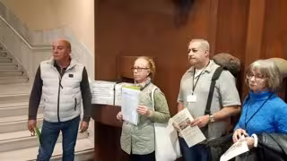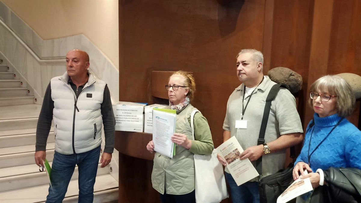 Representantes de Asamblea7islas y la Plataforma de Residencias Públicas y Dignas para Mayores y Discapacitados en la presentación de firmas en el Parlamento para exigir más plazas sociosanitarias - EUROPA PRESS
