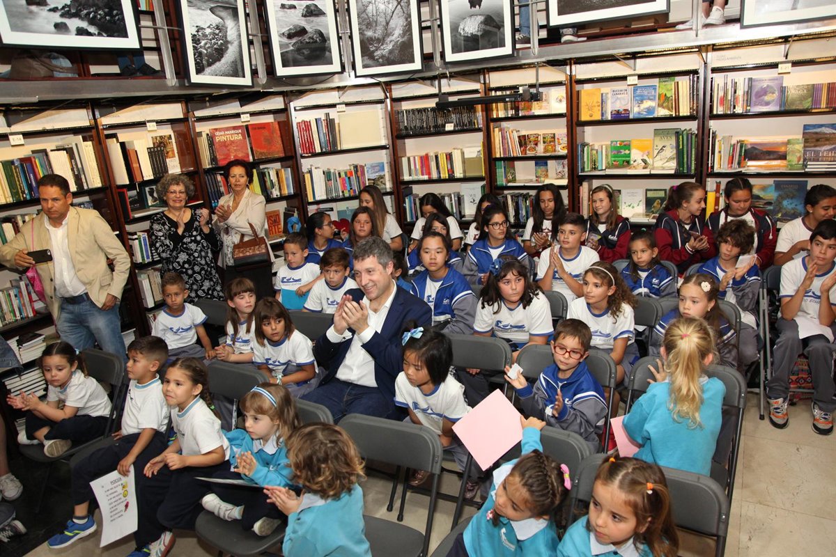 El director insular de Cultura y Educación, José Luis Rivero, fue uno de los primeros en participar con uno de los textos del poemario de Rafael Arozarena ante un grupo muy activo de escolares del colegio Echeyde III.