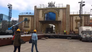 Hasta el momento está prácticamente concluida la parte central del escenario, que simula a una gran plaza, y que llevará un balcón. Tanto a la derecha como a la izquierda habrá unos edificios que se están montando para coronar este martes, explicó, debido a que es un trabajo de grúa. Asimismo, durante este lunes se pintará la pavimentación que se colocará también durante este martes.