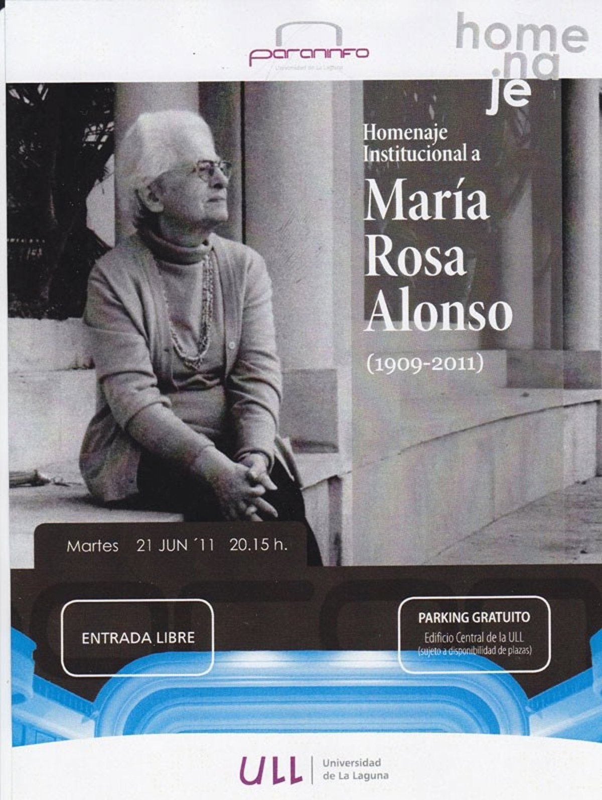 Tras el reciente fallecimiento de María Rosa Alonso, una de las plumas más importantes de las letras canarias del siglo XX, la Universidad de La Laguna ha decidido homenajear su figura con una gala que se celebrará el próximo martes, 21 de junio de 2011 a partir de las 20.00 horas en el Paraninfo de la institución académica.