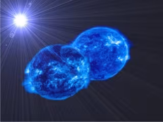 Pero, además, las estrellas de este sistema son enormemente masivas. Sus masas equivalen a 38 y 32 veces la del Sol. Unas estrellas tan enormes no se acomodan fácilmente en una órbita tan pequeña y el estudio concluye que se están tocando y el material de sus capas exteriores forma una envoltura común (lo que se conoce como una binaria de contacto).