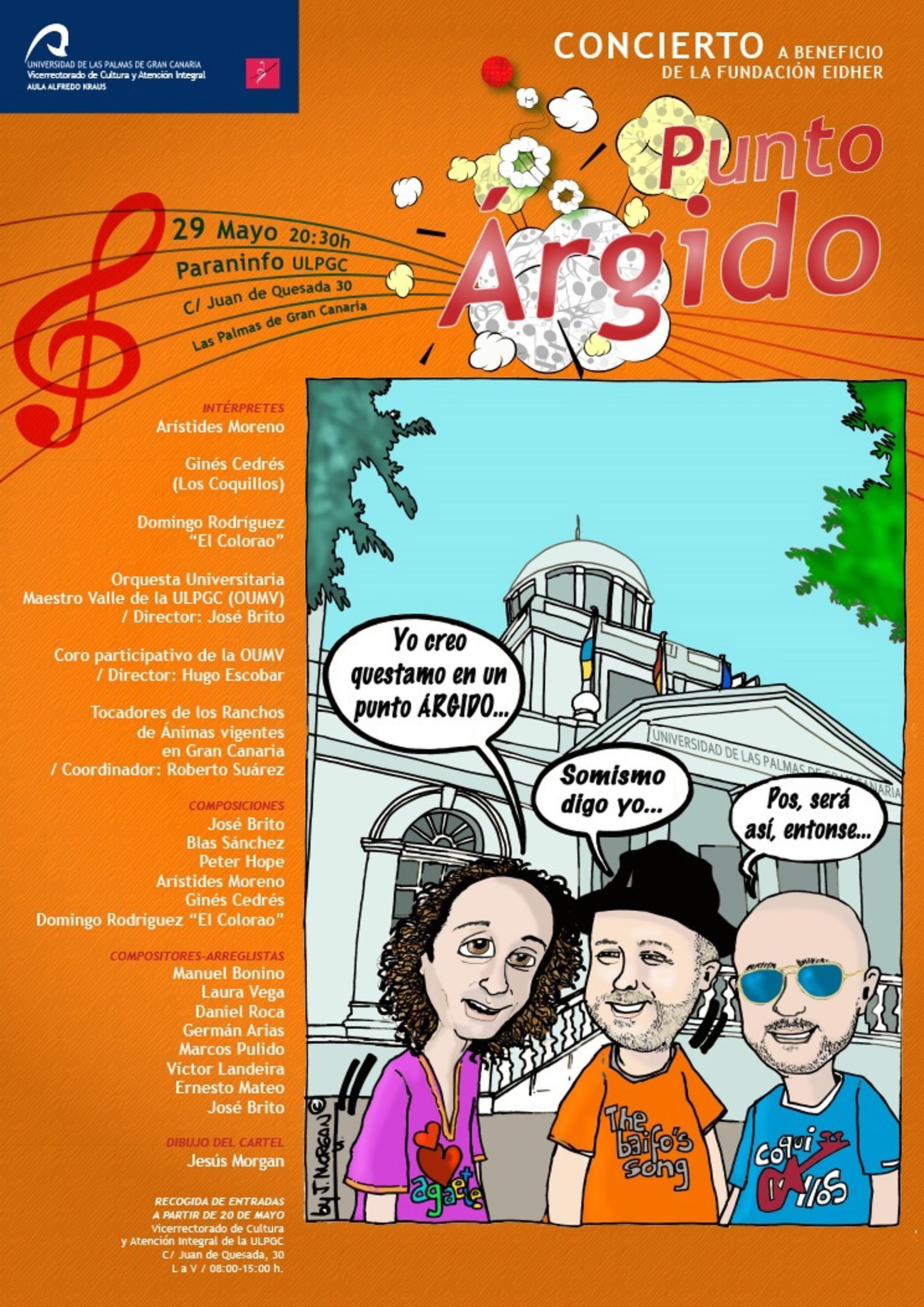 Esta cita musical contará con la participación del cantautor Arístides Moreno, el compositor y solista Ginés Cedrés de 'Los Coquillos' y el timplista Domingo Rodríguez 'El Colorao', los cuales aportan las dos primeras letras de sus nombres a este punto 'ÁR-GI-DO' a modo de acrónimo.
