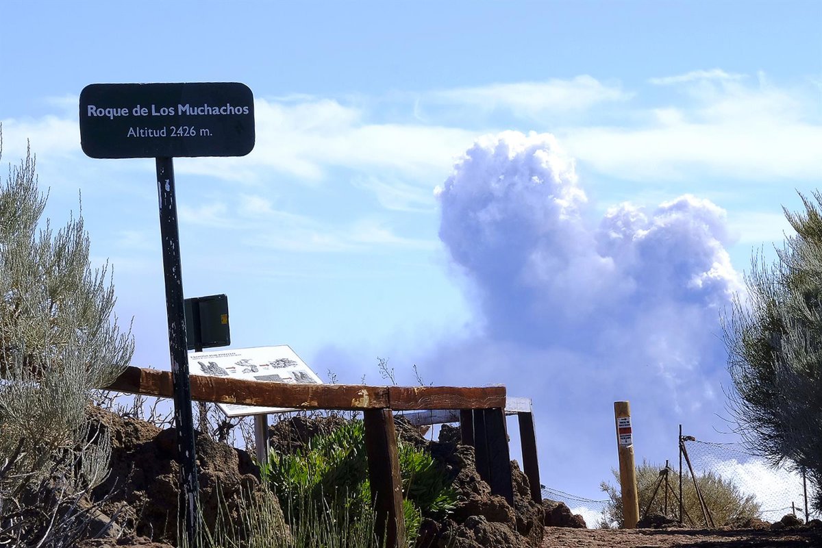 La columna de humo que sale del volcán de La Palma, vista desde el Roque de los Muchachos, a 12 de octubre de 2021, en La Palma (España). El Roque está situado al norte de la isla y es un lugar conocido por albergar algunos de los telescopios astronómic - Europa Press