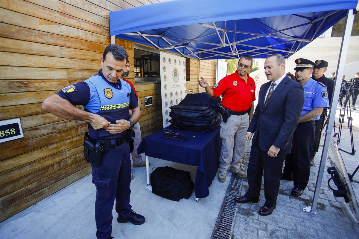 El alcalde de Las Palmas de Gran Canaria, Augusto Hidalgo, ha presentado este jueves la primera remesa de una partida de 230 chalecos de protección (antibalas) que el Ayuntamiento ha adquirido para reforzar la seguridad personal de los agentes de la Policía Local y en los que se ha invertido 130.000 euros.