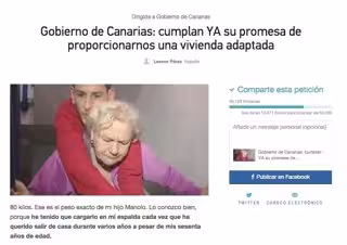 La petición de Leonor Pérez, la mujer que en Las Palmas de Gran Canaria porta a cuestas todos los días a su hijo, que sufre una distrofia muscular, y que pide una solución para su caso, alcanza más de 36.000 personas