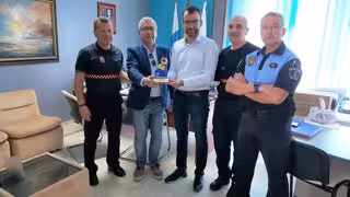 El reconocimiento fue entregado por el responsable de la campaña 'Canarias, 1500 km de Costa', Sebastián Quintana, al concejal de Seguridad, José Carlos Álamo, que estuvo acompañado del jefe de Protección Civil, Jesús González, así como del subcomisario de la Policía Local, Arquímedes Martel, y del jefe del SEIS, Amado Domínguez.