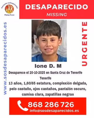 La asociación SOS Desaparecidos detalla que el menor, de nombre Ione, mide en torno a 1,60 metros y es de complexión delgada, con pelo y ojos castaños, y la última vez que fue visto vestía pantalón oscuro, camisa clara y zapatillas negras.