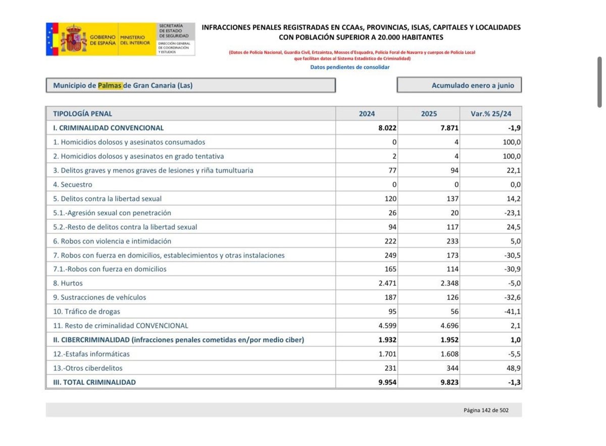 Estadísticas del Ministerio del Interior sobre la criminalidad en Las Palmas de Gran Canaria - CEDIDO POR PP LPGC