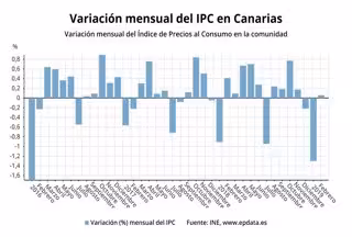 El Índice de Precios de Consumo (IPC) ha crecido en Canarias un 0,1 por ciento en febrero con respecto al mes anterior, si bien es la única comunidad en la que la tasa anual baja y lo hace en tres décimas, según los datos definitivos publicados este miércoles por el Instituto Nacional de Estadística (INE).