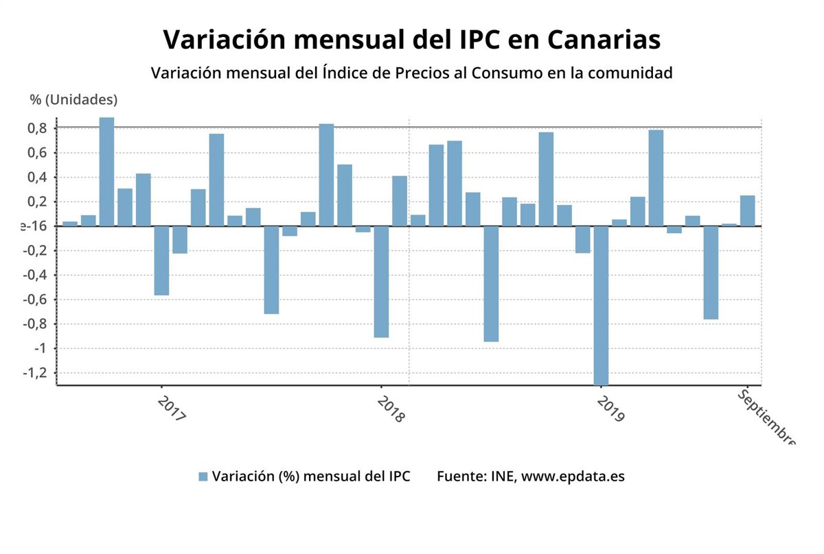 El Índice de Precios de Consumo (IPC) en Canarias ha experimentado una subida del 0,3 por ciento en septiembre con respecto al mes anterior motivado principalmente por el incremento en vestido y calzado, que creció un 7,5 por ciento, mientras que lo que más bajó fue el ocio y cultura (-2,3%).