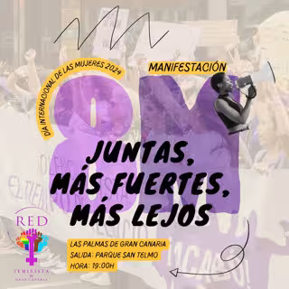 La Red Feminista de Gran Canaria ha organizado para el próximo viernes, 8 de marzo, Día Internacional de las Mujeres, una movilización bajo el lema 'Juntas: más fuertes, más lejos', que comenzará a las 19.00 horas en el parque de San Telmo, en Las Palmas de Gran Canaria, y finalizará en la plaza Santa Ana.