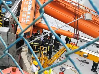 Bomberos de Las Palmas de Gran Canaria han conseguido rescatar en estado grave sobre las 17.00 horas al operario de la grúa de grandes dimensiones que se cayó durante las horas centrales de este martes en una de las explanadas del Puerto de La Luz y de Las Palmas.