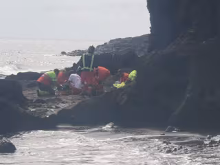 Personal de Cruz Roja y bomberos rescatan al afectado tras caerse en una zona de rocas en Montaña Roja, en la costa del municipio de Granadilla de Abona - 1-1-2 CANARIAS