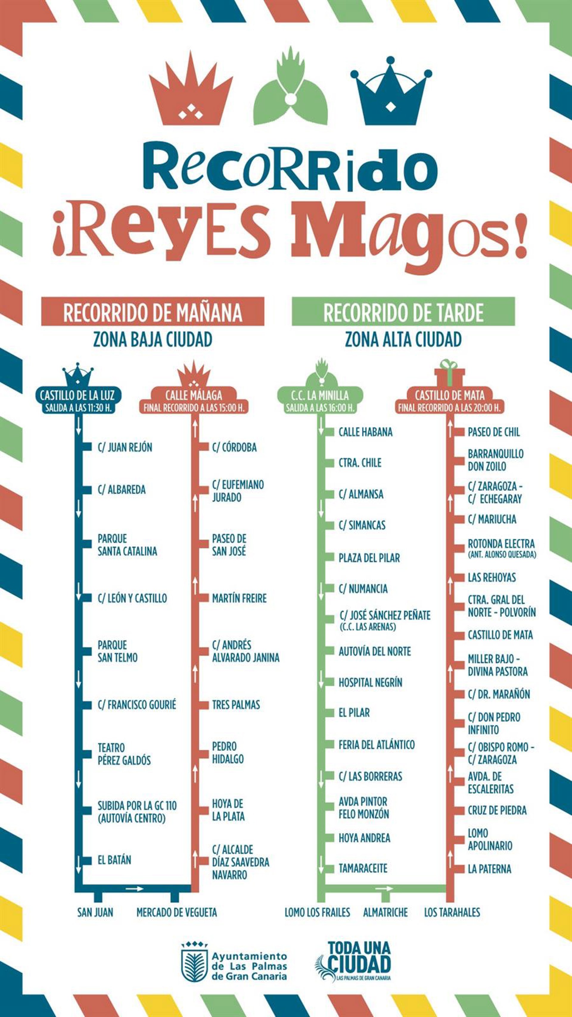 Por su parte, la comitiva real volverá a partir por la tarde desde el Centro Comercial La Minilla para recorrer la zona alta de la ciudad cruzando las calles Habana, la Carretera de Chile, Almansa, Simancas, Plaza del Pilar, Numancia, José Sánchez Peñate, la rotonda del Auditorio Alfredo Kraus y de nuevo José Sánchez Peñate para entrar en la Autovía del Norte.