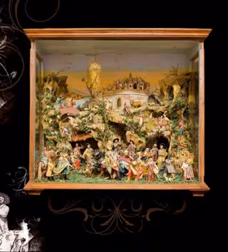 Se trata de un conjunto de gran calidad artística, que se presenta sobre un fondo rocoso desde el que puede verse una ciudad amurallada y en este marco, casi escenográfico, aparecen figuras en una distribución armoniosa, que muestra a quien se detiene y observa el detalle de que hay dos nacimientos dentro del mismo Belén. Una escena, a la derecha, representa la adoración de los pastores a la Sagrada Familia y la otra, a la izquierda, la adoración de los Reyes Magos.