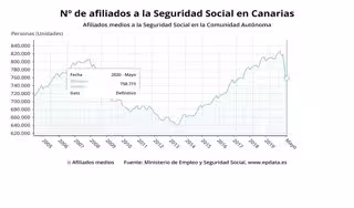 Si bien en términos interanuales, la pérdida de afiliados en Canarias se situó en 50.929 cotizantes, lo que porcentualmente se tradujo en una bajada del 6,29 por ciento con respecto a mayo de 2019, si bien estos datos muestran el impacto de la pandemia del coronavirus.