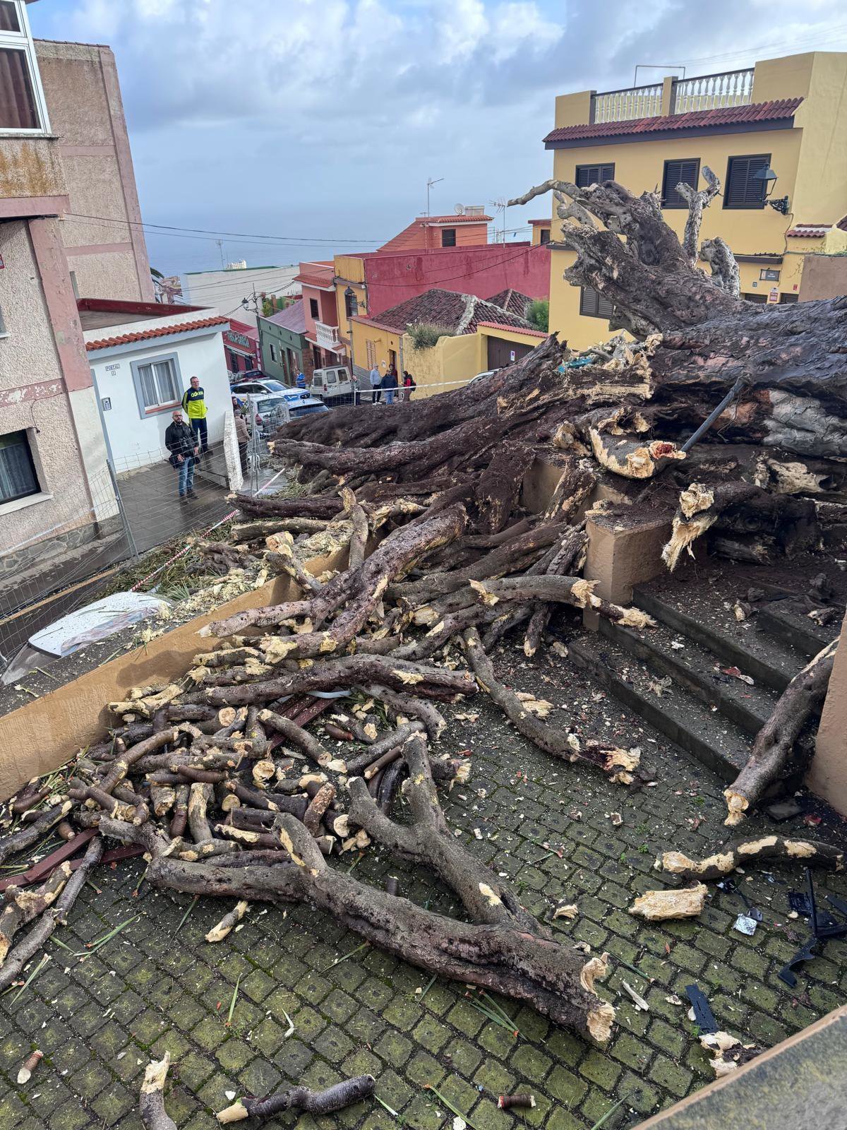 Una vez hecha la inspección presencial por el personal técnico, desde el Ayuntamiento de Los Realejos, con la colaboración del Cabildo de Tenerife y su servicio forestal, se coordinarán las labores de retirada de los restos del drago, que afectaron a siete coches, un muro y el alumbrado público.