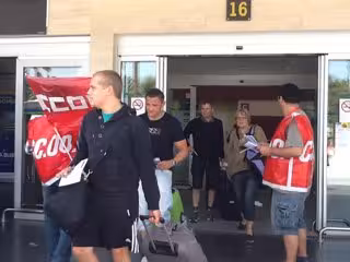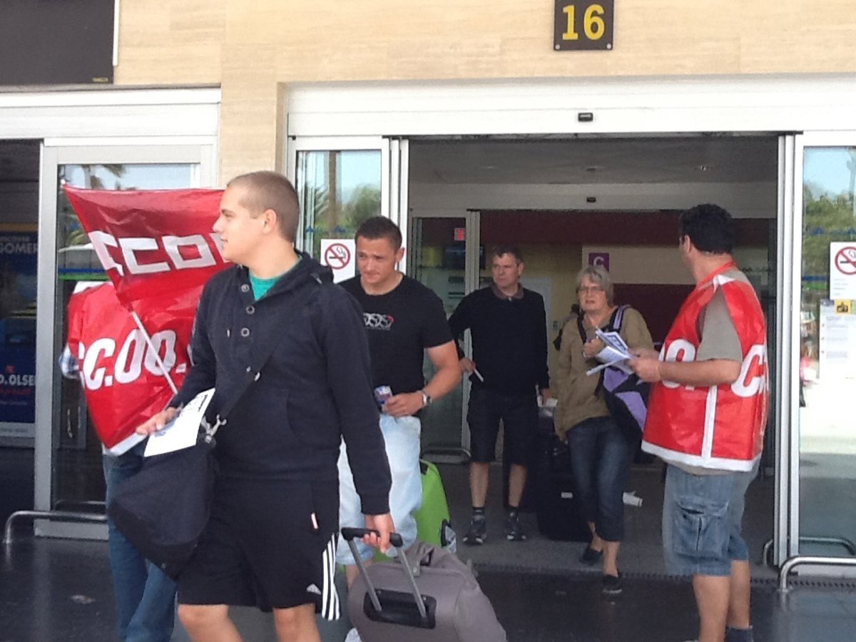 Los sindicatos CCOO, UGT, IC y USO se han concentrado este martes en el aeropuerto Tenerife Sur, donde han repartido panfletos a los visitantes en el marco del calendario de movilizaciones en defensa del Convenio de Hostelería, cuya negociación sigue en punto muerto debido al bloqueo patronal de la negociación colectiva.