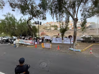 El presidente de Canarias, Fernando Clavijo, y el rector de la Universidad de Las Palmas de Gran Canaria (ULPGC), Lluís Serra, dedicaron un momento antes del Acto Solemne de Apertura del Curso 2025-2026 a saludar a un grupo de manifestantes propalestinos que se concentraron ante el edificio del Rectorado.