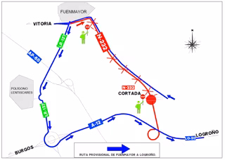 Desde este miércoles, 29 de enero a las 8,00 horas, y hasta el jueves, 30 de enero a las 20,00 horas, se procederá al corte de la N-232 sentido Logroño a la altura del punto kilométrico 400,200 en el término municipal de Fuenmayor con desvío de tráfico alternativo por la LR-137 hasta la A-12 en el cruce de Fuenmayor.