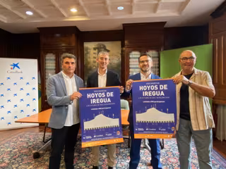 El gerente de Fundación Caja Rioja, Carlos Fuentes Ochoa, y el responsable de Acción Social de la Dirección Territorial Ebro de CaixaBank, Jorge García Cabanes, han presentado este lunes la nueva edición de la tradicional Marcha Hoyos de Iregua. También han participado Ignacio Sáenz de Urturi, director general de Medio Natural y Paisaje, y Jesús Escarza, representante de la Sociedad de Montaña Sherpa.