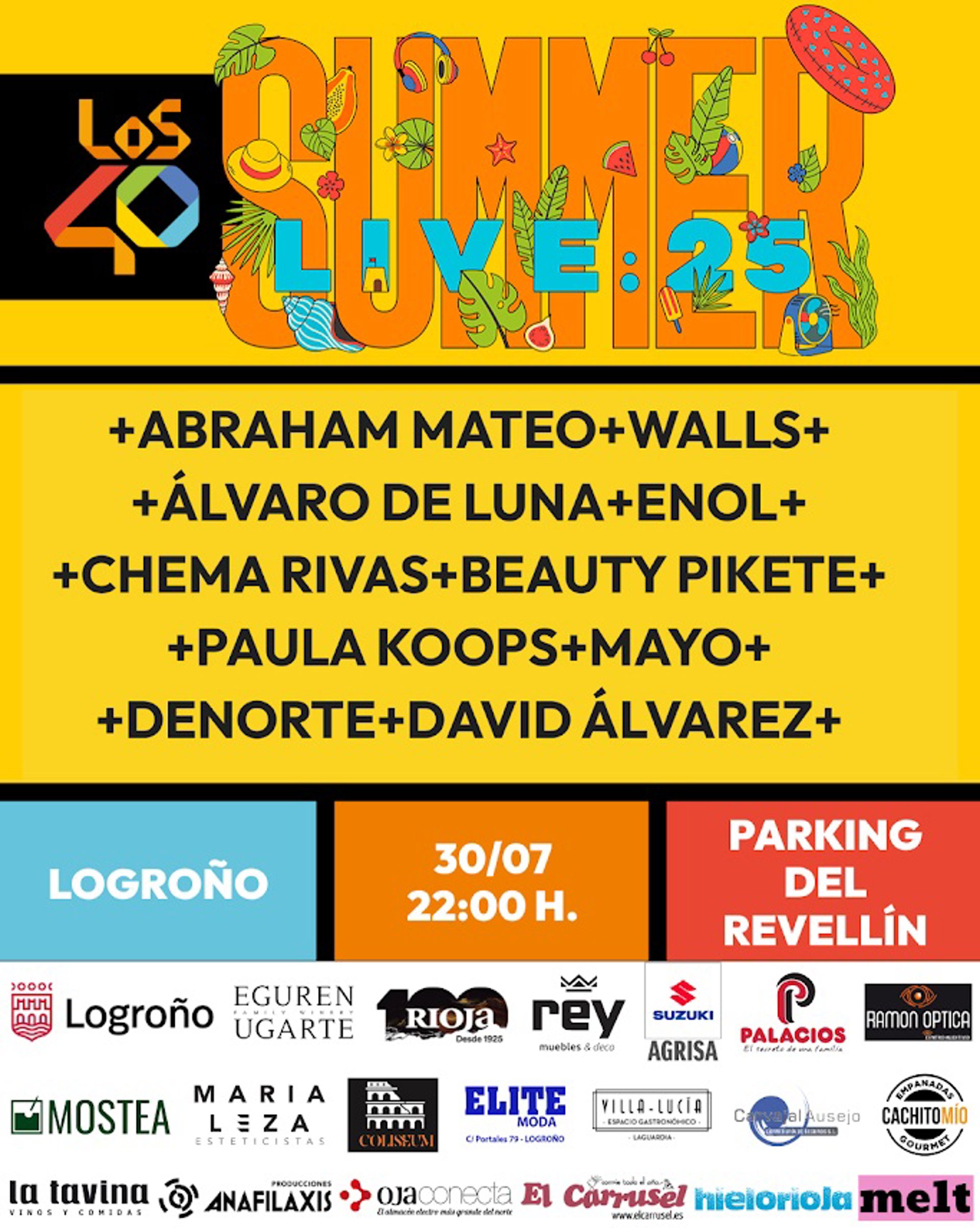 El cartel de 2025 no puede ser mejor: Abraham Mateo, Álvaro de Luna, Chema Rivas, Walls, Enol, Beauty Pikete, Paula Koops, Álvaro Mayo y el riojano Denorte que, gracias al apoyo de Los40 a los jóvenes talentos, tendrá la oportunidad de subirse al escenario al inicio de esta gran noche musical.