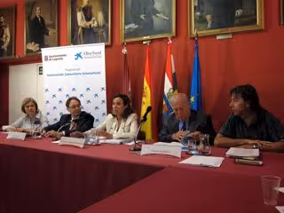La alcaldesa de Logroño, Cuca Gamarra; el director del Área de Integración Social de la Fundación "la Caixa", Marc Simón; y Carlos Giménez, catedrático de Antropología Social de la Universidad Autónoma de Madrid y coordinador del estudio, han presentado esta mañana en Logroño los resultados del estudio.