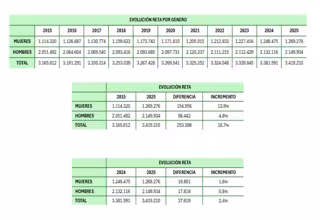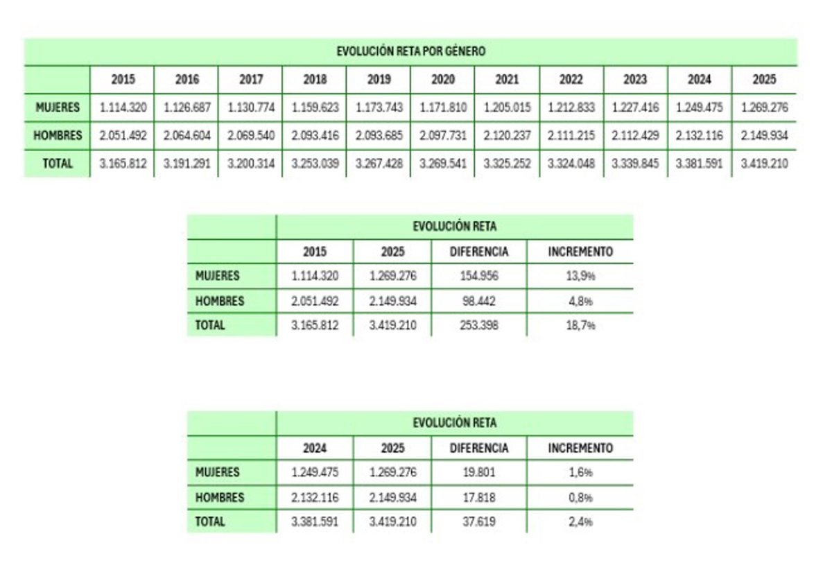 De los 37.619 nuevos cotizantes que sumó el RETA en el último año, el 52,6% (+19.801 autónomas) fueron mujeres, frente a 17.818 hombres, que representaron el 47,4% del crecimiento. Este empuje se produce a pesar de que los varones siguen representando el 62,9% del total del colectivo.