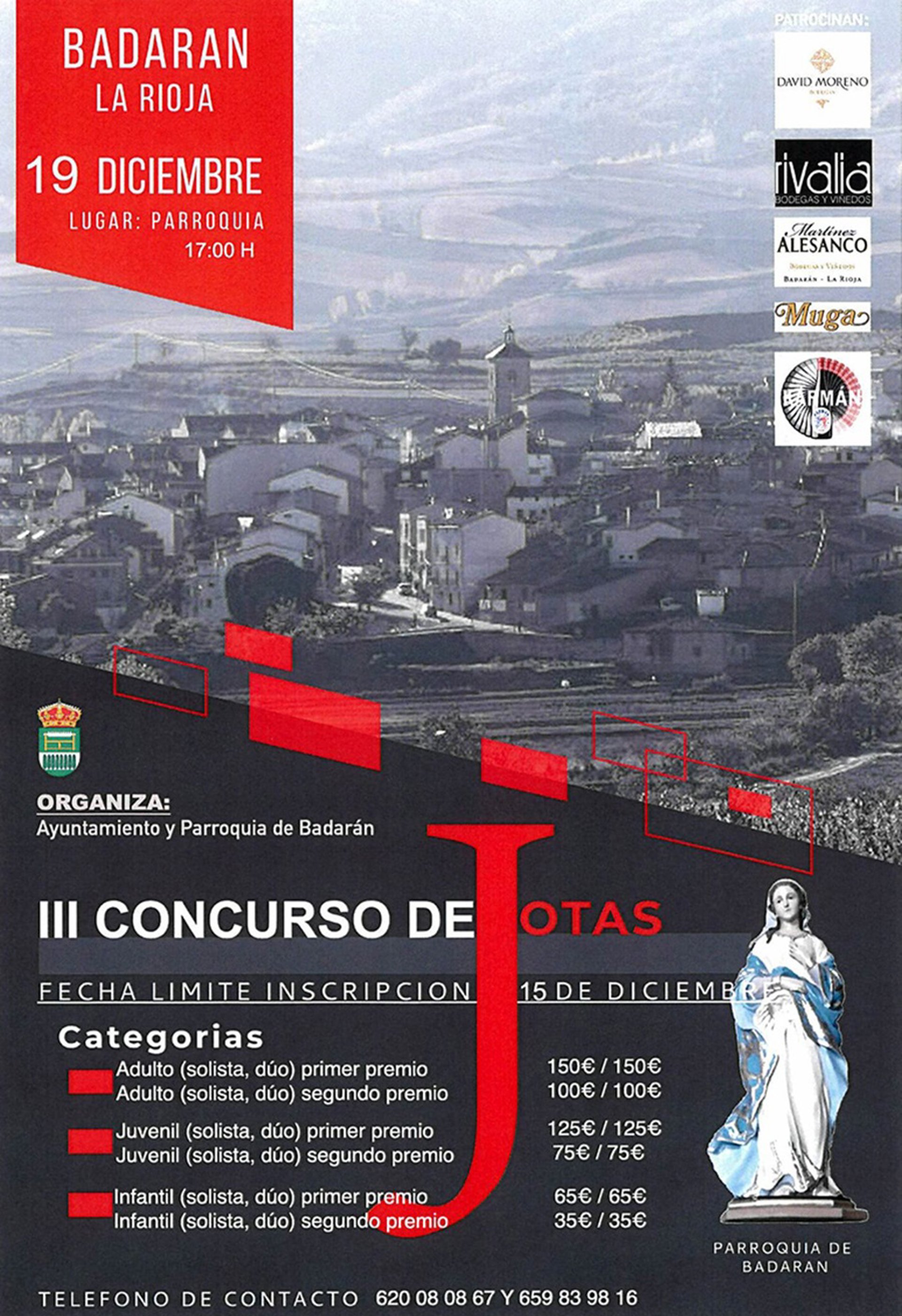 La tercera edición del Festival de Jotas de Badarán ha iniciado su nueva singladura con la apertura de las inscripciones que se podrán realizar hasta el 15 de diciembre, bien a través de los números de teléfonos 620 080 867 y 659 839 816, al WhatsApp de estos mismos teléfonos o al correo electrónico a.ruizortega.a@gmail.com