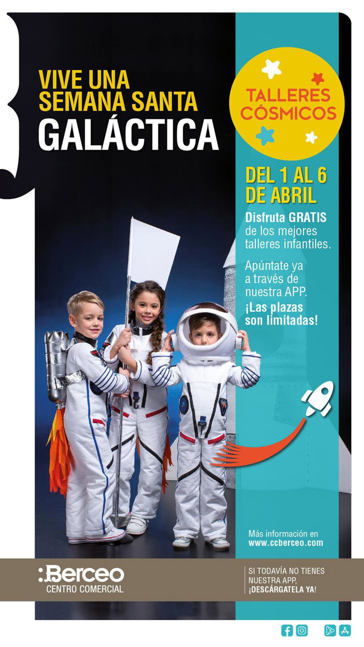 El Centro Comercial Berceo abre hoy lunes, 25 de marzo, el plazo de inscripciones para los talleres infantiles gratuitos del programa 'Vive una Semana Santa Galáctica' que se van a celebrar desde el lunes 1 de abril (día festivo de apertura del centro) hasta el sábado 6 de abril, coincidiendo con la Semana de Pascua en la que los escolares no tienen colegio. En esta ocasión el Centro Comercial ha elegido el tema del cosmos, la galaxia y el maravilloso mundo que les rodea como un guiño a su propio espacio infantil, 'Planetario Berceo'.