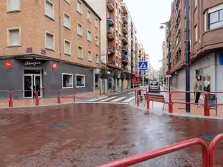 El cruce de esta calle con Huesca se ha realizado de forma elevada y se ha liberado de la presencia del aparcamiento mientras se reduce, de esta forma, el paso rodado y aparecen unas pequeñas zonas con jardineras que separan y protegen al peatón del tráfico.