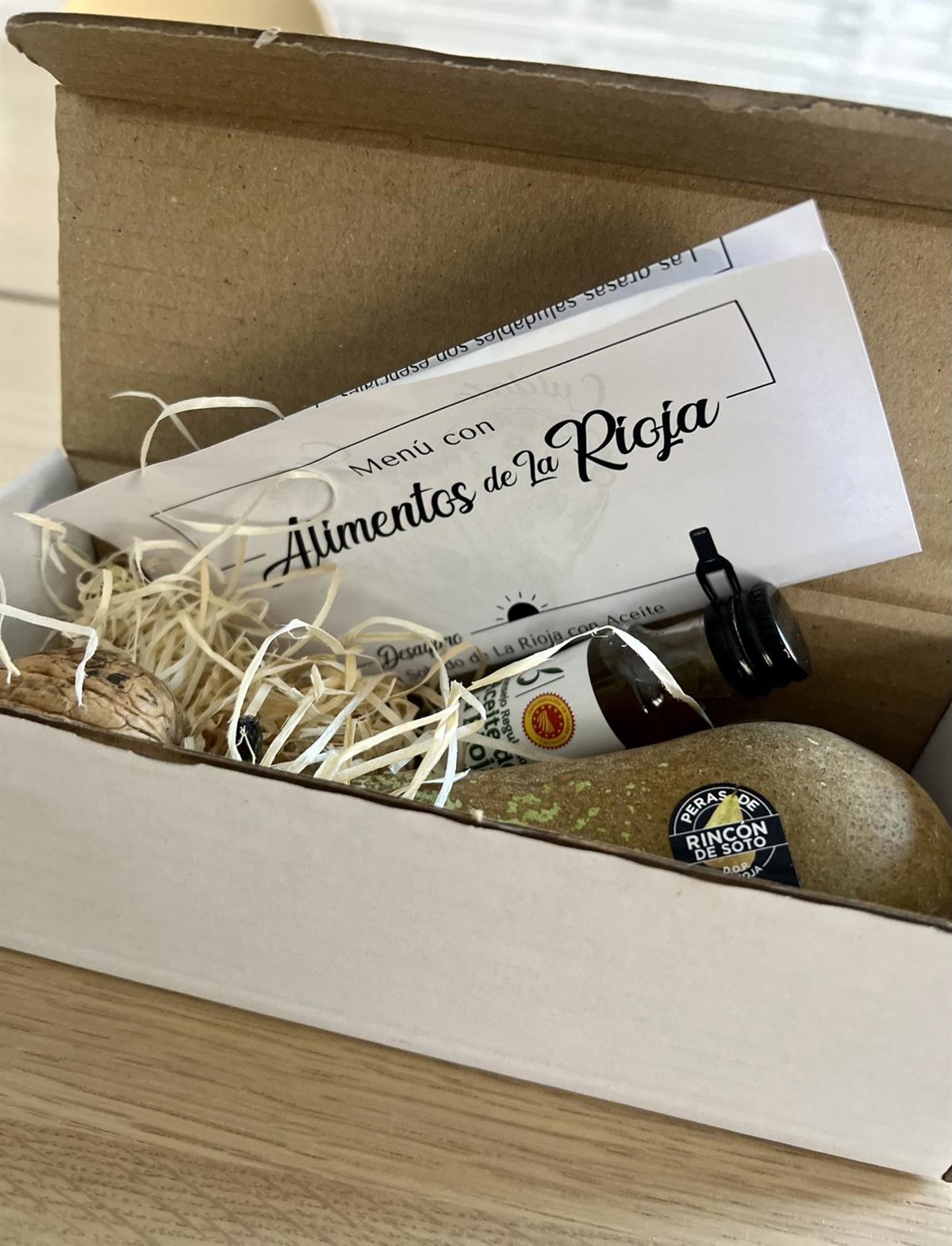 En su interior se puede encontrar una monodosis de Aceite de La Rioja, una Nuez de Pedroso y una Pera de Rincón de Soto. Tres productos de La Rioja, que cuentan con denominación de origen y que poseen propiedades beneficiosas para el corazón.