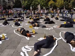 Así, alrededor de 30 personas vestidas de negro se han tumbado en el centro de la plaza para demostrar "que la tauromaquia no es otra cosa que la escena de un crimen".