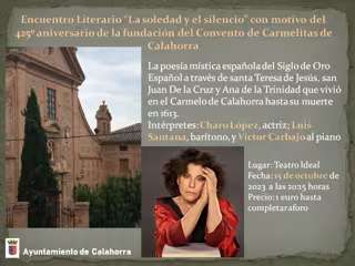 Con motivo del 425 aniversario de la fundación del Convento de las religiosas descalzas de la Orden de Nuestra Señora del Monte Carmelo en nuestra ciudad y coincidiendo con la festividad de Santa Teresa de Jesús, el Ayuntamiento de Calahorra ha programado un Encuentro literario el viernes, 15 de octubre, en el teatro Ideal a las 20,15 horas.