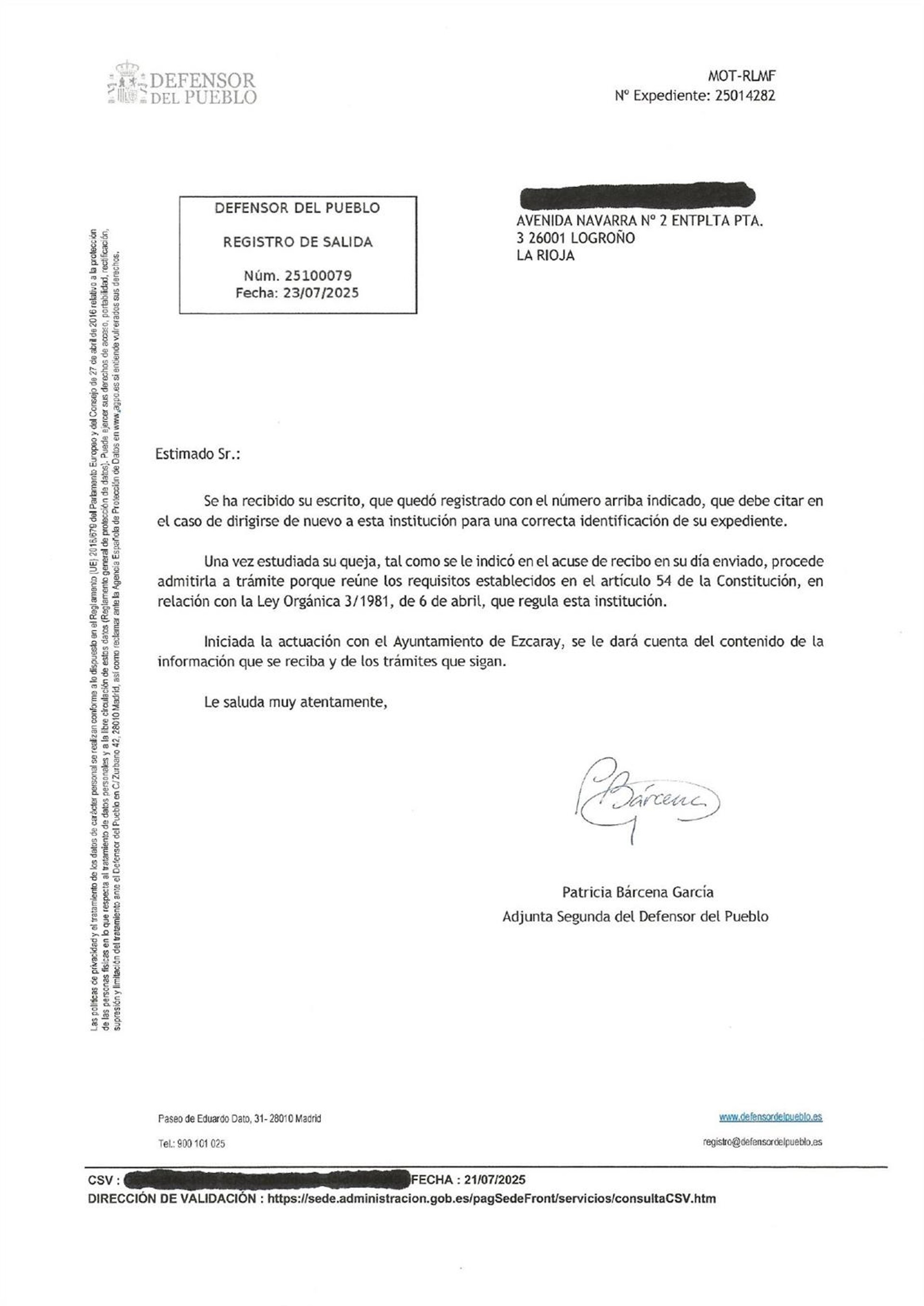 A partir de ahora, ha indicado, se iniciarán las diligencias correspondientes con el Ayuntamiento de Ezcaray, y se les informará del contenido de las respuestas que se obtengan y de los pasos que se sigan.