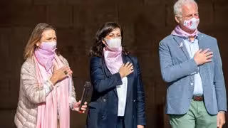 Eguizábal, Andreu y Hermoso de Mendoza, con la mano en el corazón, haciendo honor al lema 'Saca pecho por ellas', en el Día Mundial del Cáncer de Mama. - GOBIERNO DE LA RIOJA