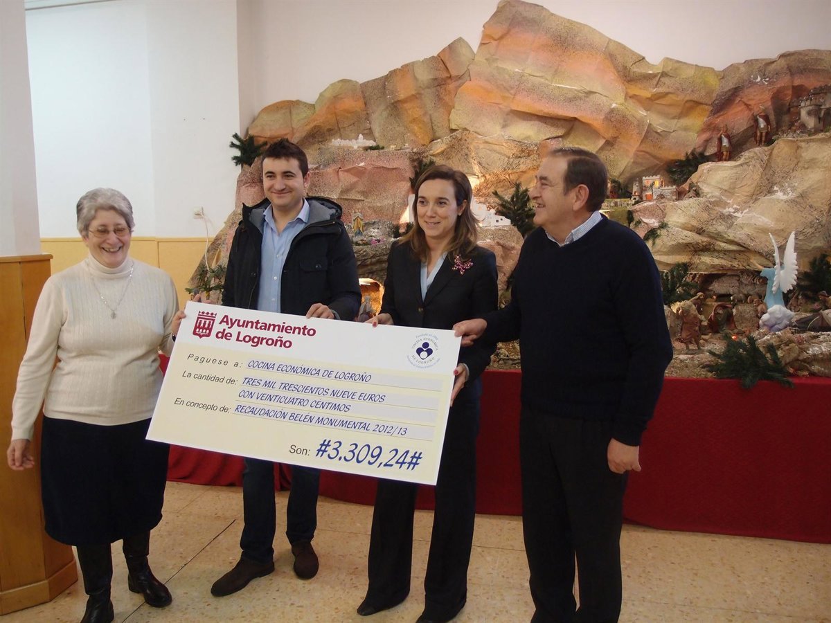 La alcaldesa de Logroño, Cuca Gamarra, ha participado esta mañana en el acto de entrega de los más de 3.300 euros recaudados en el río del Belén Monumental, instalado en la Plaza Consistorial, a la Cocina Económica.