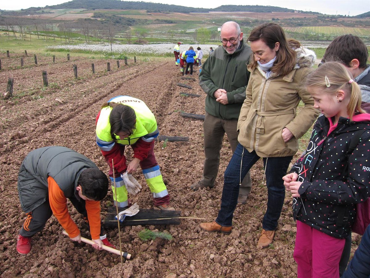 Alrededor de 125 escolares de 3º y 4º de Primaria, de los colegios Pío X y Bretón de los Herreros han sido los encargados este jueves, en La Grajera, de plantar 200 ejemplares de pino piñonero y carrasco, una actividad organizada por el Ayuntamiento de Logroño con motivo del Día del árbol, en la que han estado acompañados por la alcaldesa de Logroño, Cuca Gamarra.
