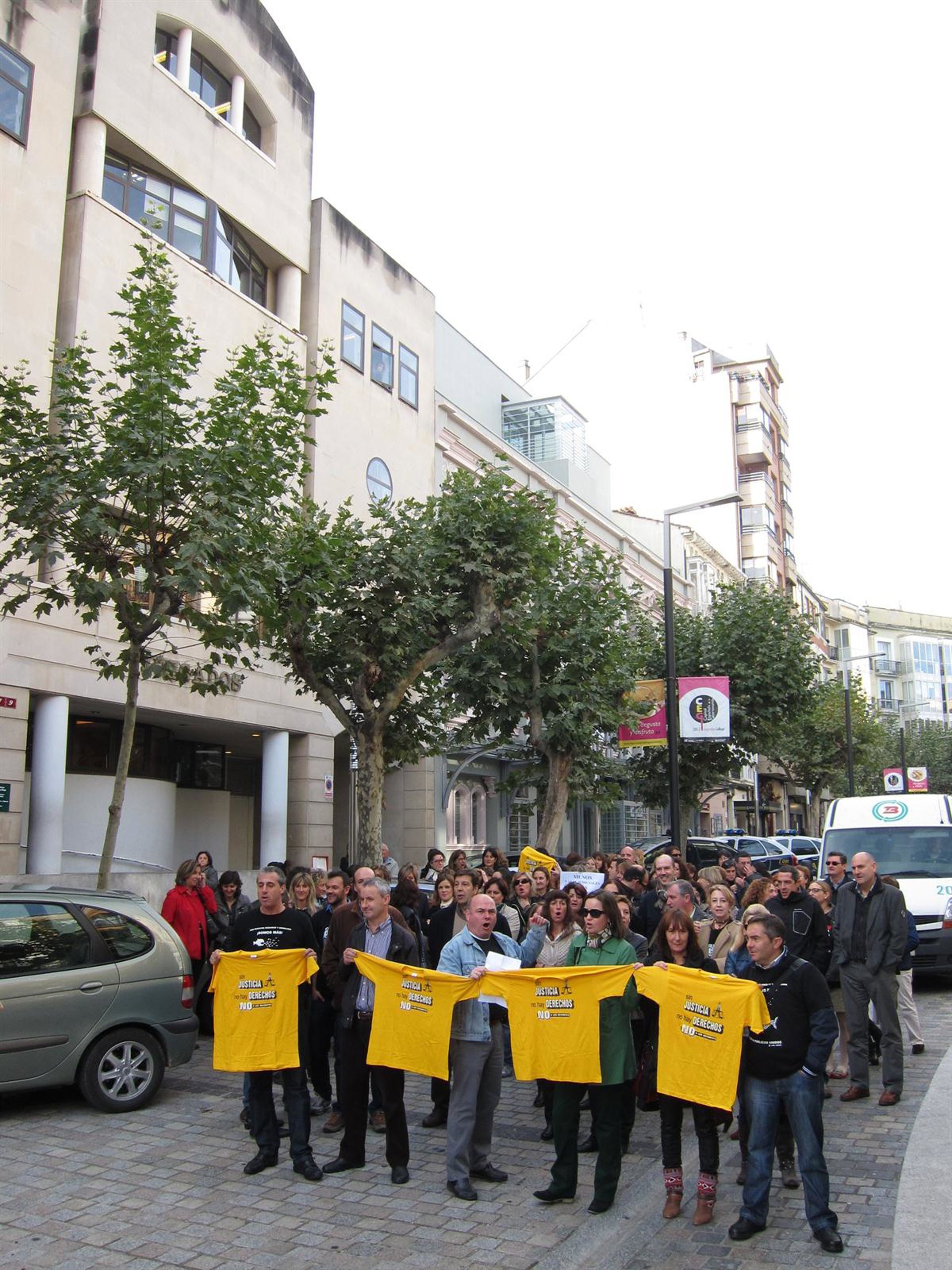 Una acción de protesta, convocada por la Plataforma de sindicatos de justicia nacional, en la que se encuentran CSIF, CCOO y UGT. Los manifestante han mostrado una serie de camisetas amarillas, en la que llevaban estampada la frase 'Sin justicia no hay derechos. No a los recortes'.