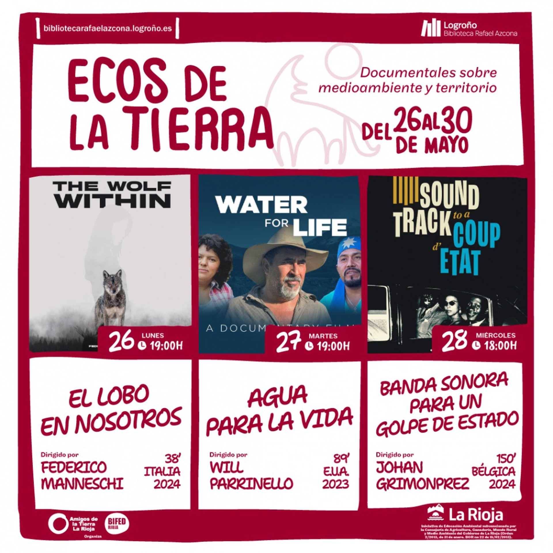 Amigos de la Tierra La Rioja organiza del 26 al 30 de mayo 'Ecos de la Tierra', una muestra de cine documental sobre medioambiente que se celebrará en el salón de actos de la Biblioteca Rafael Azcona. La entrada es libre hasta completar el aforo.