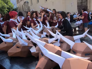 Bajo esta premisa se ha ofrecido una actividad visual en la que decenas de activistas han estado cubiertos con dichas cabezas y, vestidos de peñistas, para denunciar "el sufrimiento gratuito de unos pobres animales para diversión de una minoría de la sociedad logroñesa".