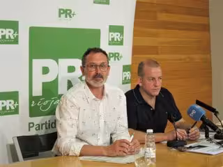 El presidente del Partido Riojano (PR), Rubén Antoñanzas, y el alcalde de Tricio, Óscar Martínez, durante la rueda de prensa esta mañana - EUROPAPRESS