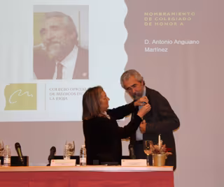 La Asamblea General del Colegio Oficial de Médicos de La Rioja (COMLR) ha aprobado el nombramiento de Antonio Anguiano como colegiado de honor. La presidenta del Colegio de Médicos de La Rioja, Inmaculada Martínez, impuso a Anguiano la insignia de oro con el emblema formado por una rama de laurel y otra de palma entrelazadas, que enmarcan el bastón con nudos y serpiente enroscada sobre libro abierto.