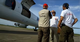 Archivo - Cooperantes de Cáritas junto a un avión. - CARITAS INTERNATIONALIS - Archivo