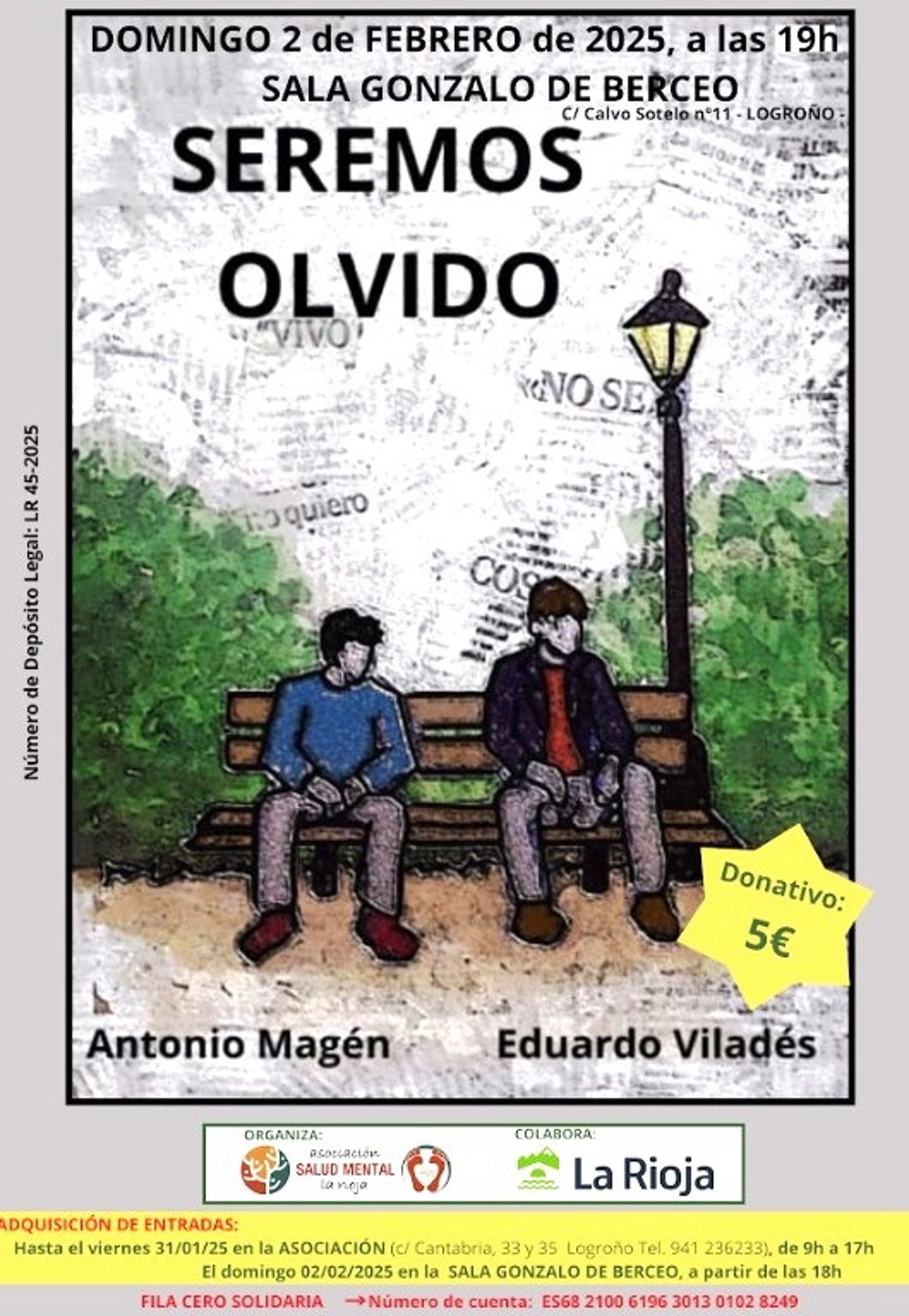La Asociación Salud Mental La Rioja auspicia la representación en Logroño del drama social en tres actos de Eduardo Viladés 'Seremos olvido'. Una cita que será este domingo 2 de febrero a las 19 horas en la Sala Gonzalo de Berceo.